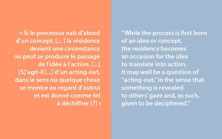 La myriade de tactiques et de stratégies professionnelles (des artistes) et vernaculaires (les compétences socio-esthétiques des habitants), déployées dans le but d’infiltrer et de séjourner dans un espace commun, active autant de leviers qui laissent émerger des potentialités, déstabilisent les sujets et commandent un continuel réajustement des postures. […] C’est le lieu où les acteurs se mettent à risque dans un incessant réglage de leurs rapports, à distance ou à proximité, en composant avec les conjonctures, les hasards et les imprévus. […] La dimension spéculative confère aussi aux projets d’art actuel un caractère d’œuvre ouverte. On ne sait ni comment ni jusqu’à quand ce qui est activé in vivo continue à œuvrer. Cela relève de la pure spéculation.