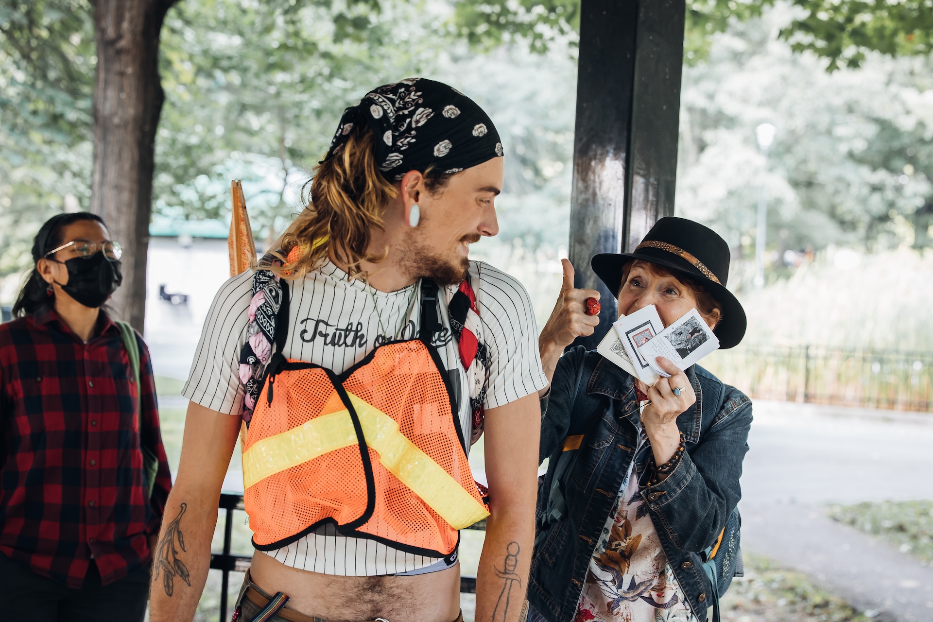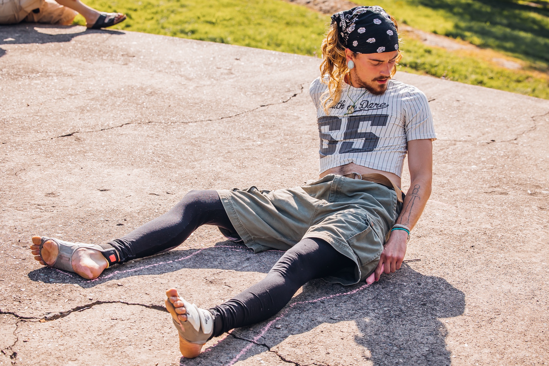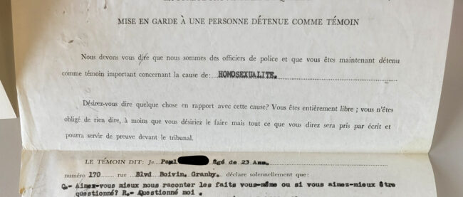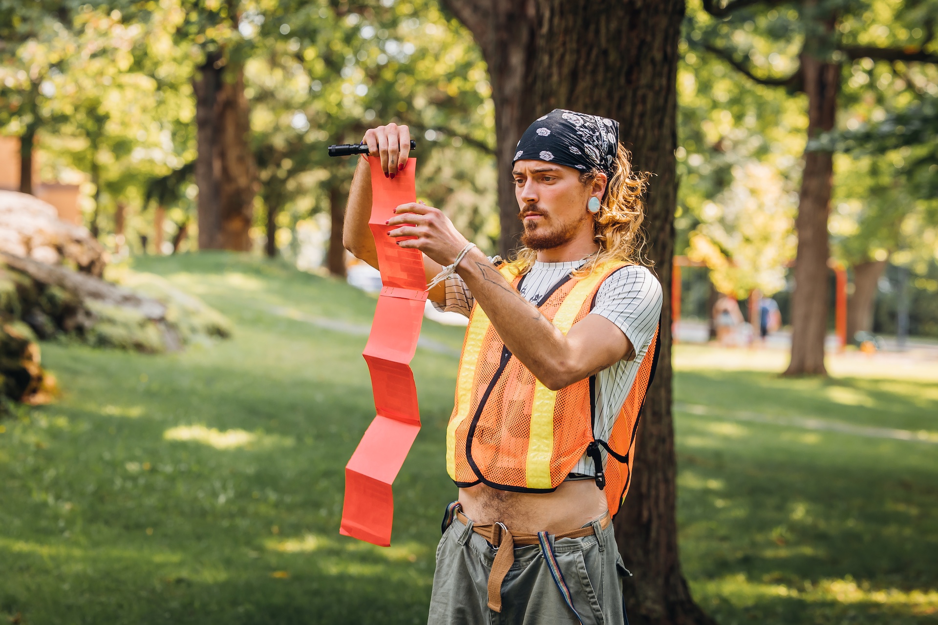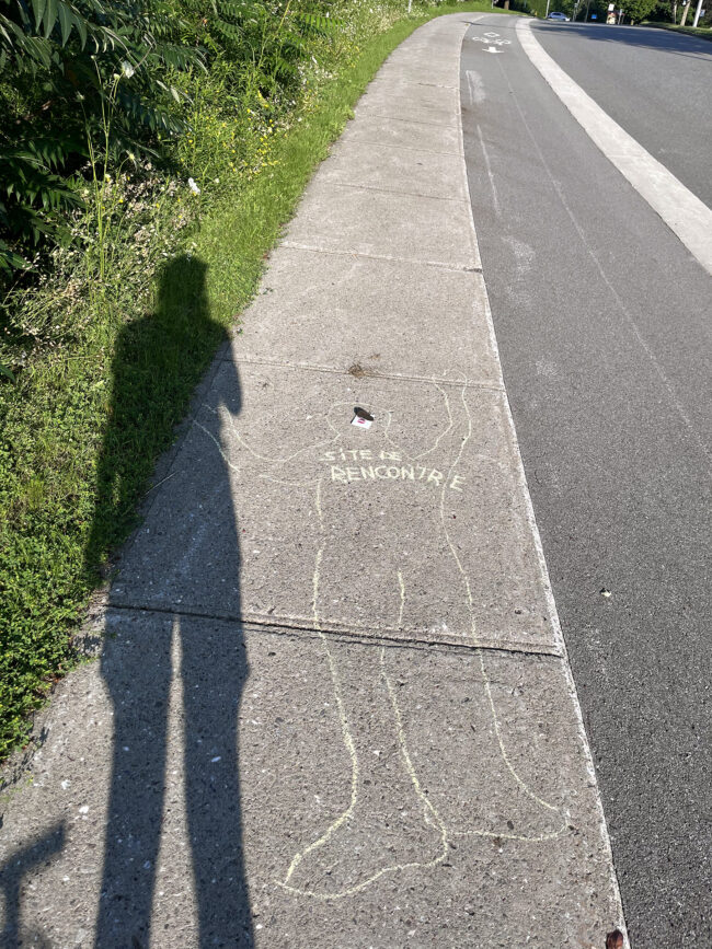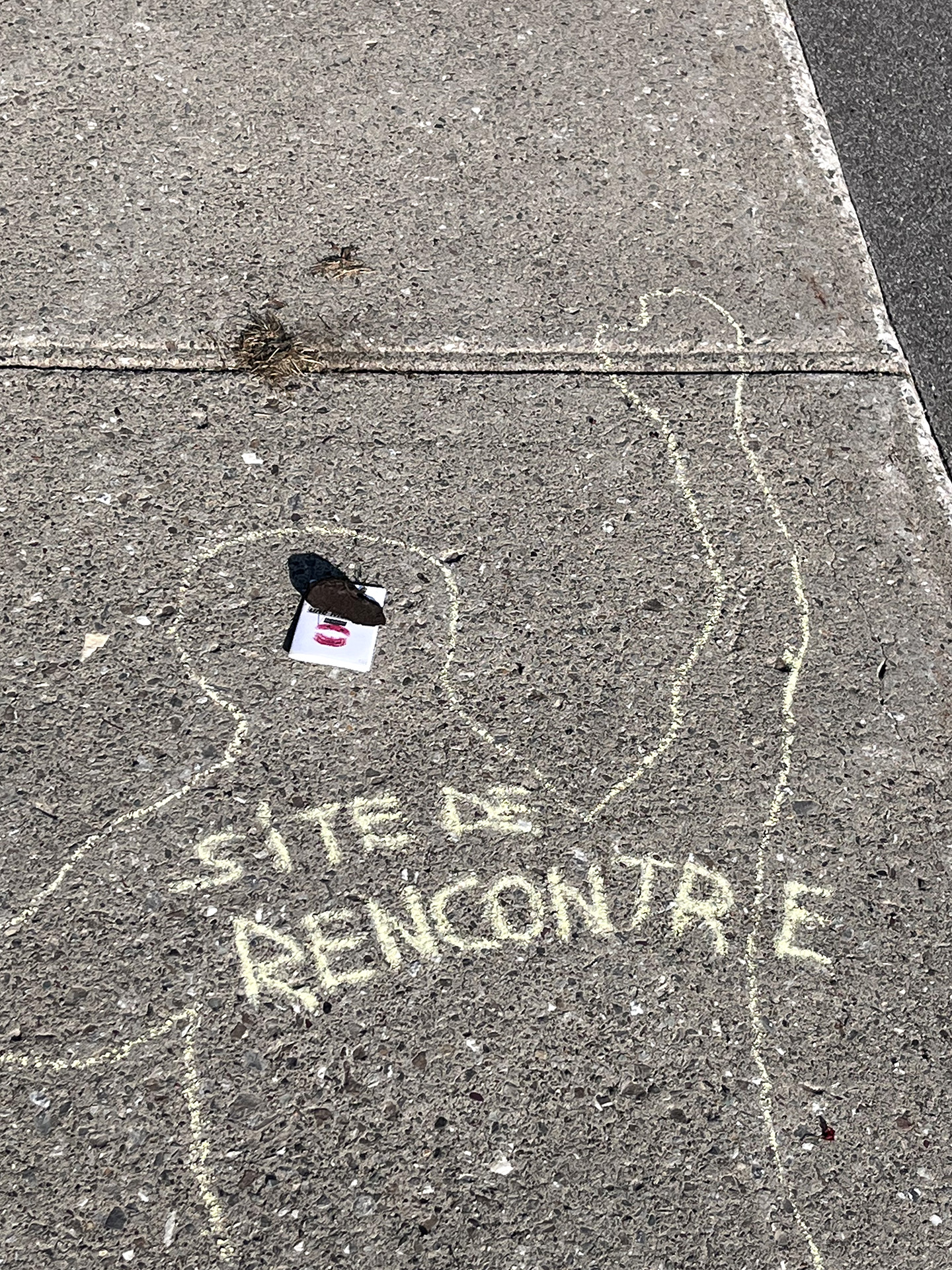 Dans les archives de la Société d’histoire, des coupures de journaux des années 1950 relatent une sinistre arrestation de jeunes hommes accusés d’homosexualité. L’arrestation par l’escouade des crimes contre nature a eu lieu dans un gymnase dont le bâtiment est toujours existant. L’artiste convoque une marche et déploie un geste symbolique à cet endroit. Se tournant vers des groupes communautaires dédiés à la cause LGBTQ+, il organise la tenue de discussions et d’un atelier de création de zines, les engageant à y exposer leurs points de vue. Autre part, n’hésitant pas à mettre en jeu sa propre vulnérabilité, Ézéchiël Nadeau repère et fouille d’anciens lieux de drague clandestins dans des boisés où il s’active à bricoler des artéfacts trouvés, à chorégraphier des gestes performatifs. Sur le web, il détourne des applications de rencontre pour susciter des rendez-vous; ce faisant, il injecte de la sociabilité là où on ne l’attend pas. Il lance une invitation à un 5 à 7 dans le studio de sa résidence d’artiste, s’introduit dans des soirées micro-ouvert où il performe la lecture de ses zines. Pour générer un partage intergénérationnel, il réalise des entretiens avec une militante transgenre. À même le bitume d’un stationnement, il improvise une performance où il dessine à la craie le contour de son corps; à l’intérieur il inscrit Site de rencontre.