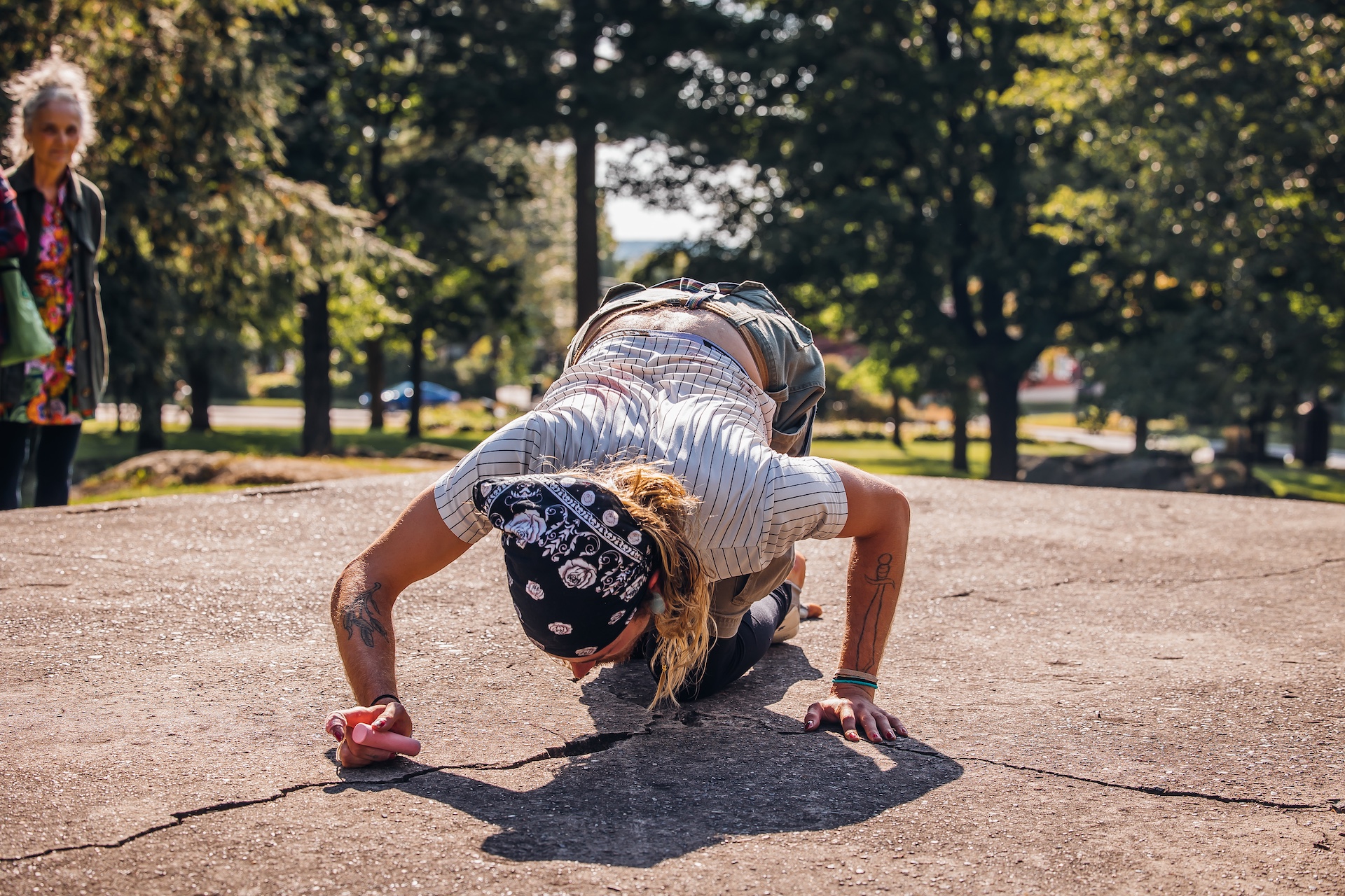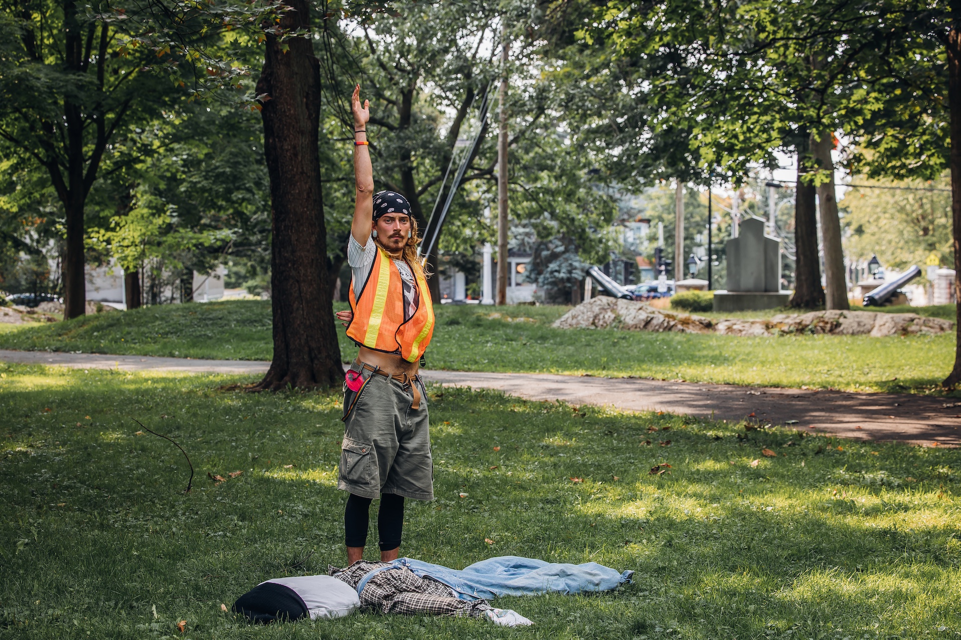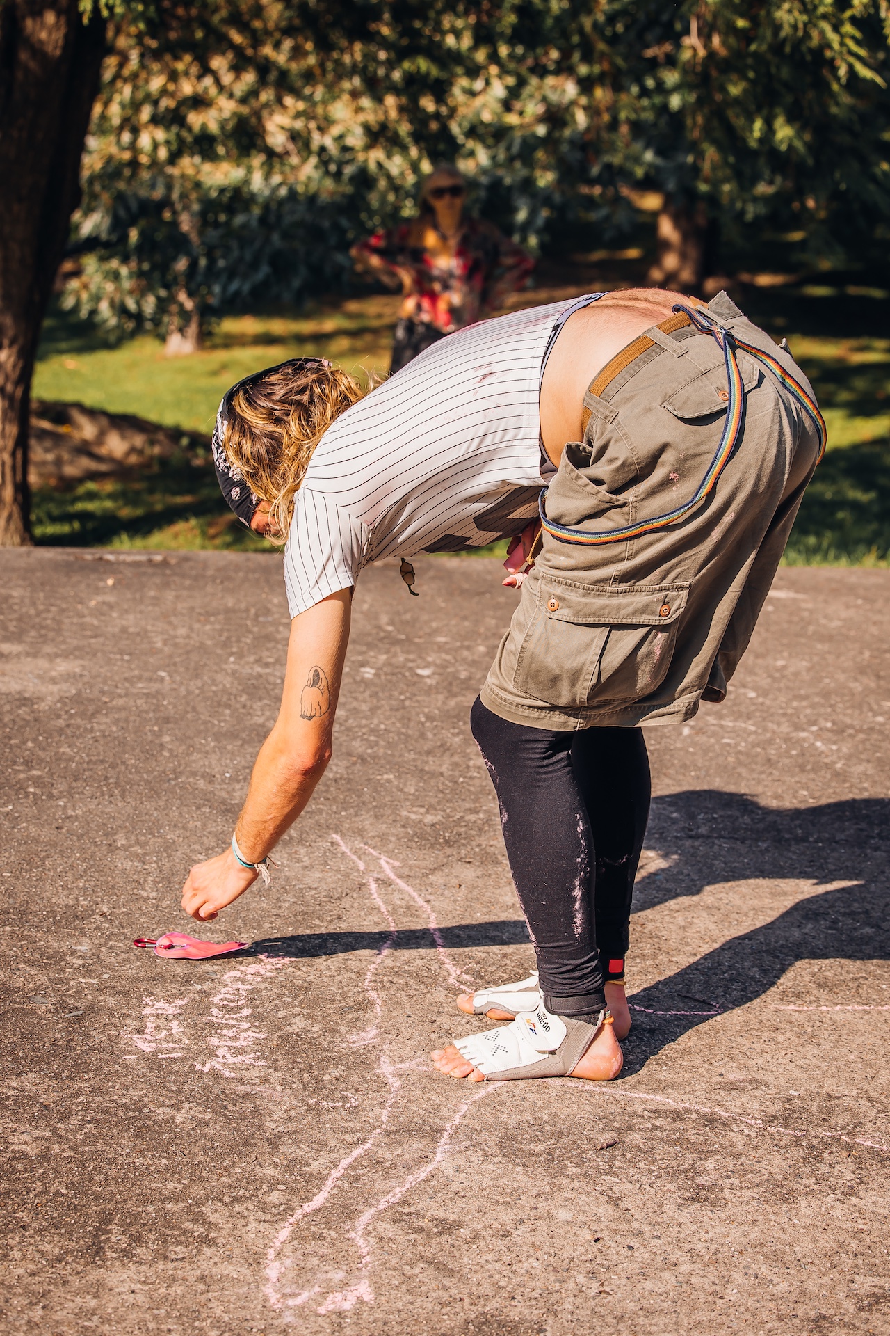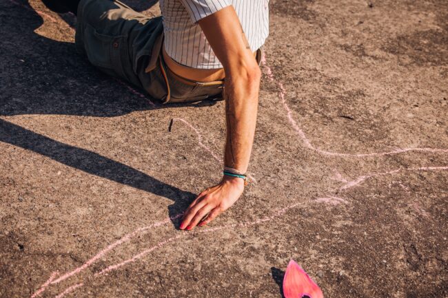 Dans les archives de la Société d’histoire, des coupures de journaux des années 1950 relatent une sinistre arrestation de jeunes hommes accusés d’homosexualité. L’arrestation par l’escouade des crimes contre nature a eu lieu dans un gymnase dont le bâtiment est toujours existant. L’artiste convoque une marche et déploie un geste symbolique à cet endroit. Se tournant vers des groupes communautaires dédiés à la cause LGBTQ+, il organise la tenue de discussions et d’un atelier de création de zines, les engageant à y exposer leurs points de vue. Autre part, n’hésitant pas à mettre en jeu sa propre vulnérabilité, Ézéchiël Nadeau repère et fouille d’anciens lieux de drague clandestins dans des boisés où il s’active à bricoler des artéfacts trouvés, à chorégraphier des gestes performatifs. Sur le web, il détourne des applications de rencontre pour susciter des rendez-vous; ce faisant, il injecte de la sociabilité là où on ne l’attend pas. Il lance une invitation à un 5 à 7 dans le studio de sa résidence d’artiste, s’introduit dans des soirées micro-ouvert où il performe la lecture de ses zines. Pour générer un partage intergénérationnel, il réalise des entretiens avec une militante transgenre. À même le bitume d’un stationnement, il improvise une performance où il dessine à la craie le contour de son corps; à l’intérieur il inscrit Site de rencontre.
