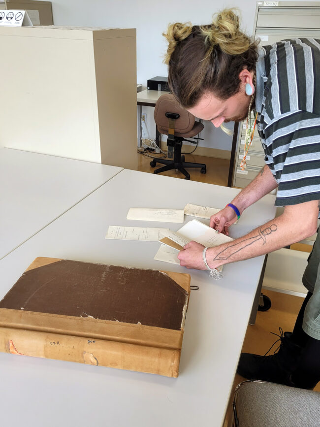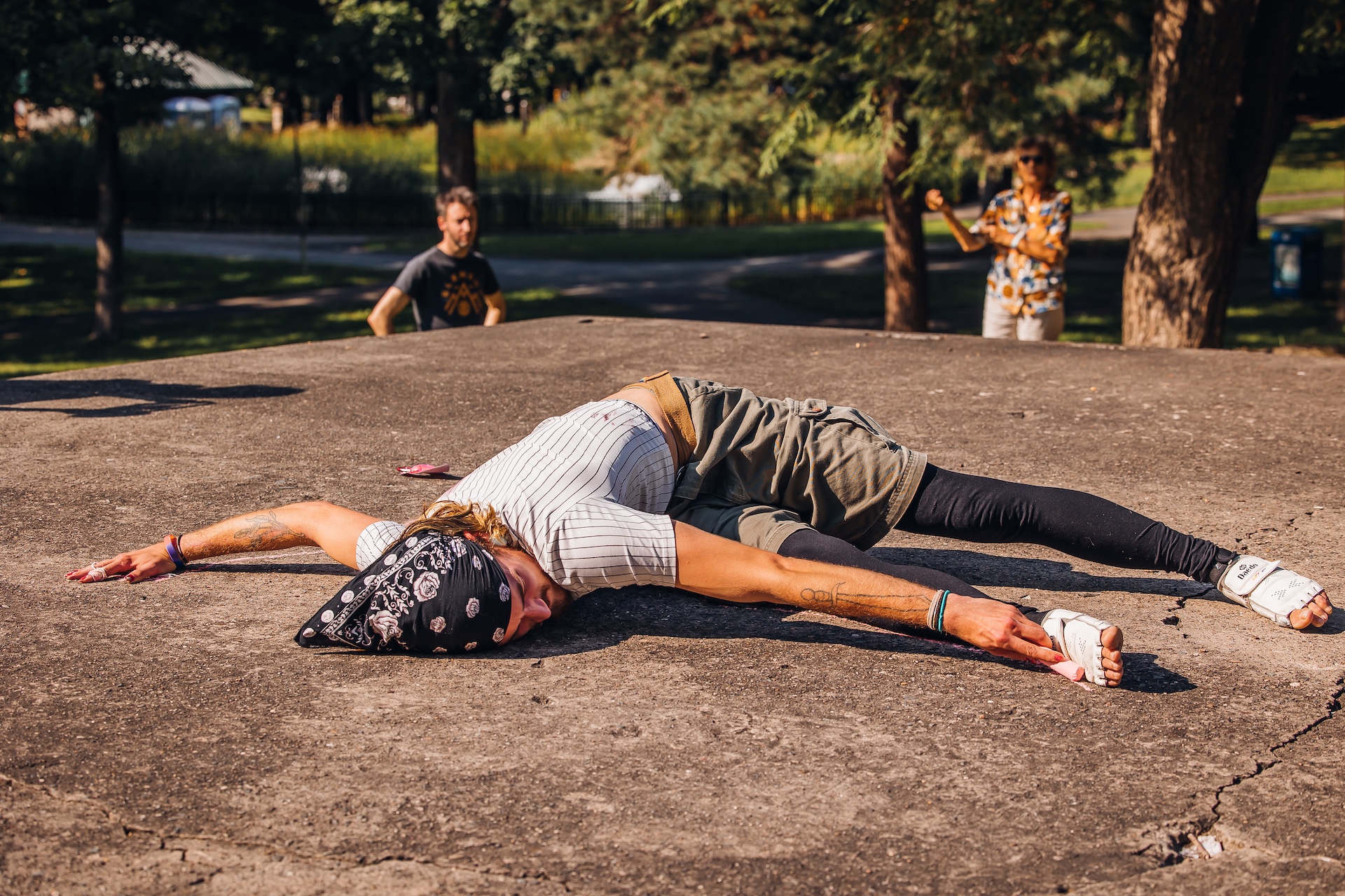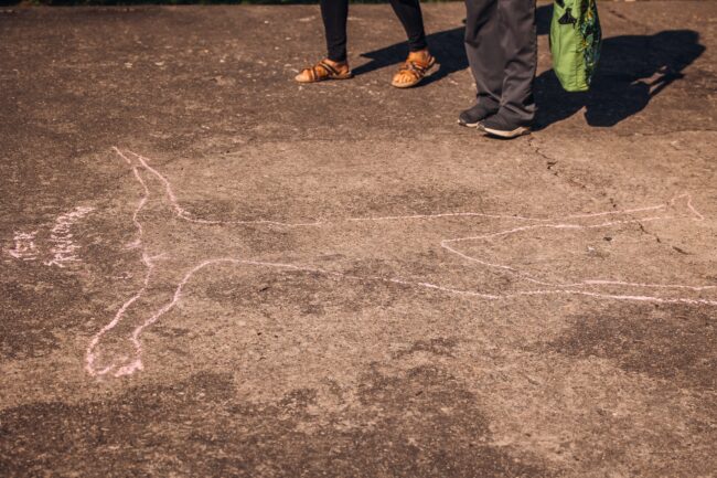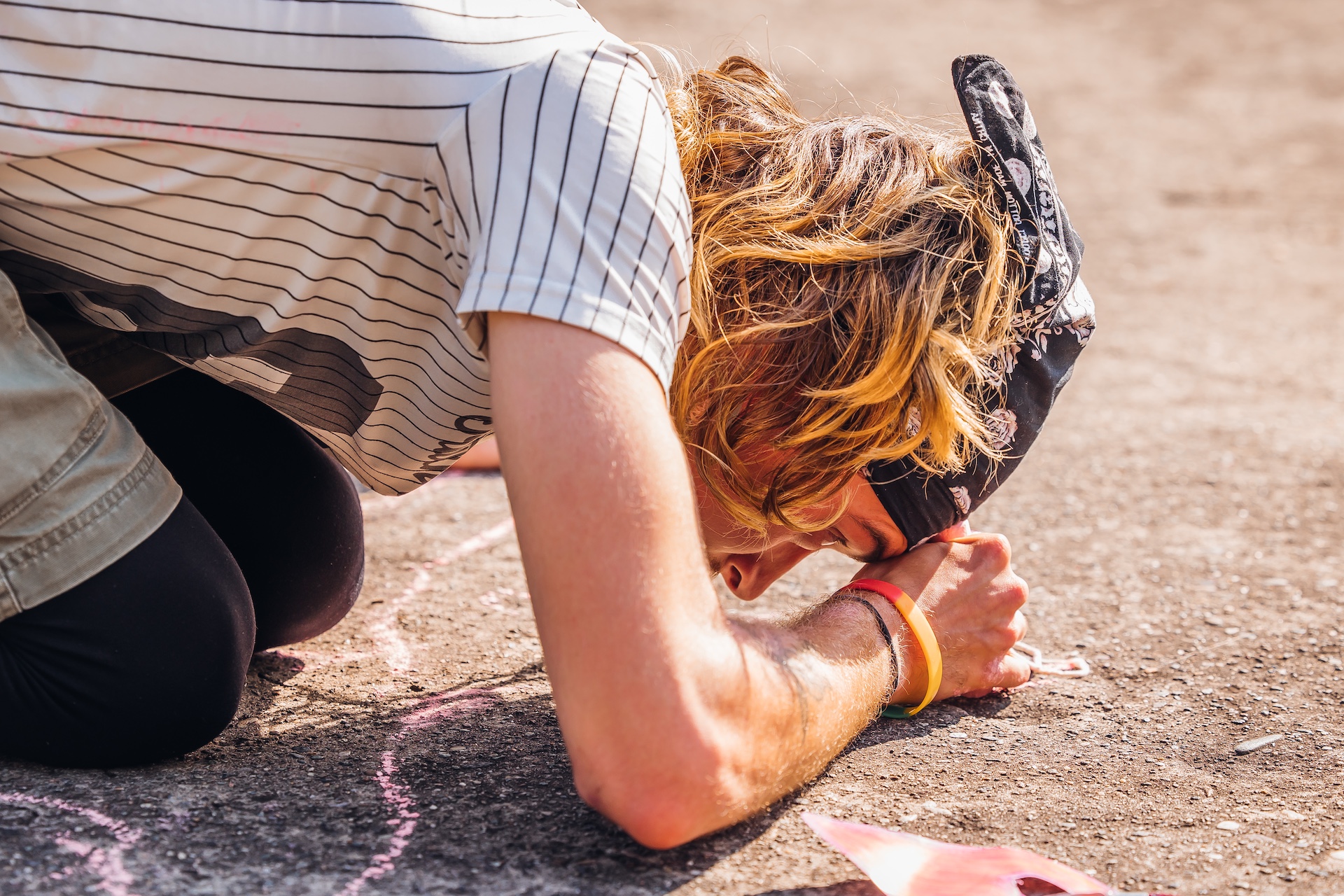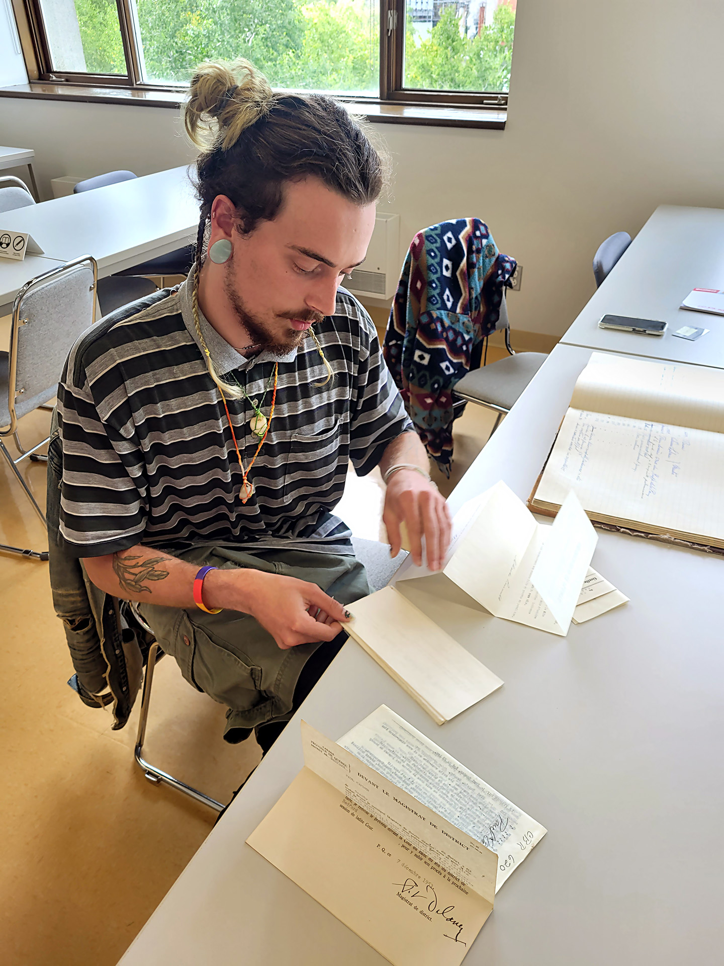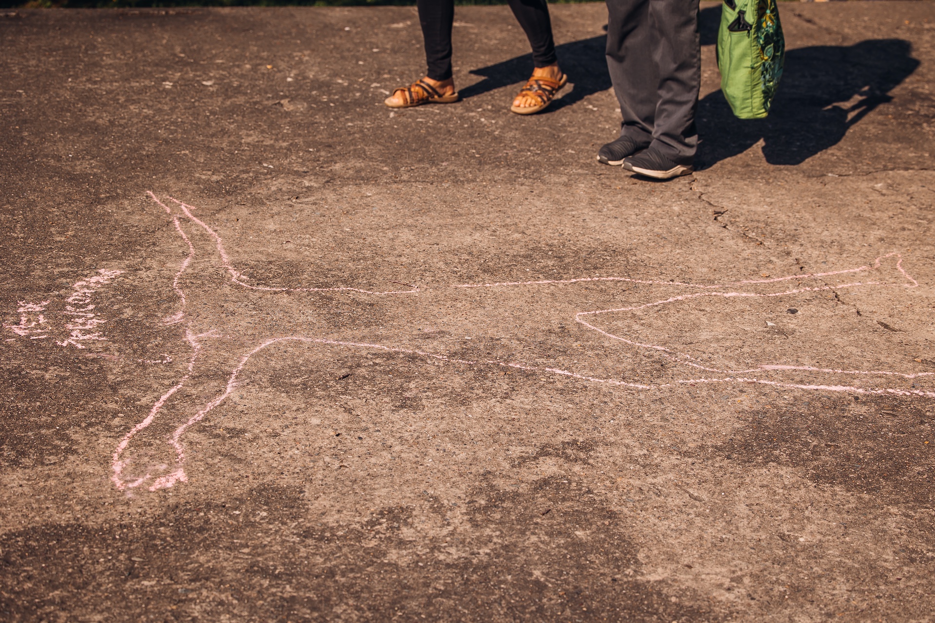 Dans les archives de la Société d’histoire, des coupures de journaux des années 1950 relatent une sinistre arrestation de jeunes hommes accusés d’homosexualité. L’arrestation par l’escouade des crimes contre nature a eu lieu dans un gymnase dont le bâtiment est toujours existant. L’artiste convoque une marche et déploie un geste symbolique à cet endroit. Se tournant vers des groupes communautaires dédiés à la cause LGBTQ+, il organise la tenue de discussions et d’un atelier de création de zines, les engageant à y exposer leurs points de vue. Autre part, n’hésitant pas à mettre en jeu sa propre vulnérabilité, Ézéchiël Nadeau repère et fouille d’anciens lieux de drague clandestins dans des boisés où il s’active à bricoler des artéfacts trouvés, à chorégraphier des gestes performatifs. Sur le web, il détourne des applications de rencontre pour susciter des rendez-vous; ce faisant, il injecte de la sociabilité là où on ne l’attend pas. Il lance une invitation à un 5 à 7 dans le studio de sa résidence d’artiste, s’introduit dans des soirées micro-ouvert où il performe la lecture de ses zines. Pour générer un partage intergénérationnel, il réalise des entretiens avec une militante transgenre. À même le bitume d’un stationnement, il improvise une performance où il dessine à la craie le contour de son corps; à l’intérieur il inscrit Site de rencontre.