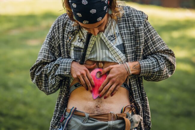 La performativité est le moteur principal de cette quête-manifeste. Manœuvrant dans l’impromptu de ses découvertes, l’artiste concrétise cette performativité dans une forme conjuguant les actions in situ ou in socius et la fabrication de zines. Le zine, ayant ici le statut d’auto-documentation de ses actions, sert de point de chute au dessin, à l’écriture, au détournement de propos transphobes et à l’humour. Il est aussi le vecteur d’une dissémination activée par la distribution spontanée d’exemplaires papier, réalisée à petite échelle.