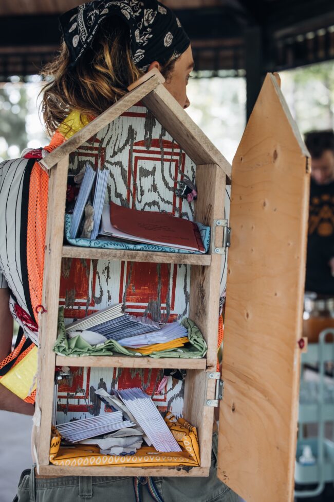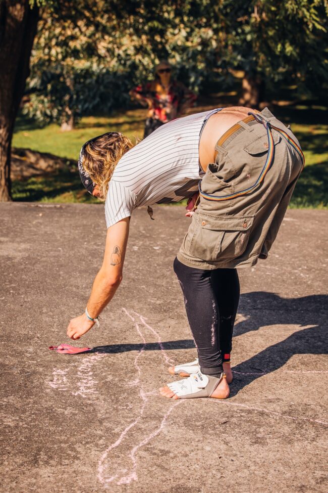 Porté par le désir de tisser des liens, de rassembler, de (se) manifester, d’exister ensemble, l’artiste utilise la marche et les rencontres comme stratégies de mise en œuvre. Un corpus audacieux de micro-interventions en émerge. En voici quelques fragments.