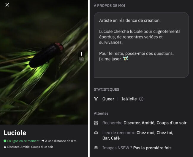 Projet Lampyridae fait référence aux lucioles, ces porteuses de lanternes qui, grâce à la bioluminescence, communiquent entre elles en émettant de la lumière. Inspiré de l’esthétique de la contreculture et des luttes sociales, Projet Lampyridae constitue une quête d’émancipation et un manifeste à l’épreuve de l’homogénéisation du monde. Embrassant l’utopie comme attitude et acte de résistance, Ézéchiël Nadeau explore les territoires actuels et l’histoire occulte de la communauté locale LGBTQ+ pour émettre, dans la pluralité du tissu social, des signaux poétiques et révéler, à intensités variables, des réalités, des tensions, des récits.